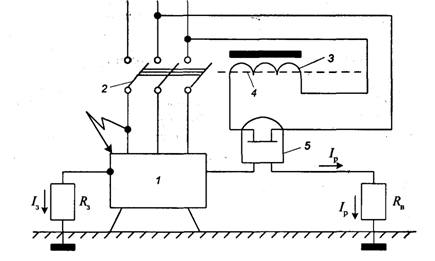 1 – корпус электроустановки, 2- автоматический выключатель, 3 - отключающая катушка, 4 – сердечник катушки, 5 – реле максимального напряжения, Rз – сопротивление защитного заземления, Iз – ток замыкания, Iр – ток, протекающий через реле, Rв – сопротивление вспомогательного заземления