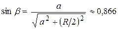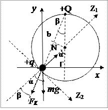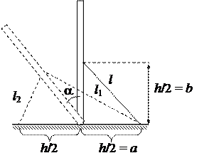 Заметим, что движение груза массы m на верёвках, есть вращение вокруг оси, проходящей через их точки крепления- А и В. Другими словами, система представляет собой “наклонный математический маятник”. Составляющая силы тяжести mg, направленная вдоль оси вращения, не влияет на колебания, а перпендикулярная составляющая- mg sin β является возвращающей силой по отношению к грузу. Таким образом, можно использовать формулу Гюйгенса для нахождения периода колебаний данного маятника только с эффективным значением ускорения свободного падения g*= g sin β: