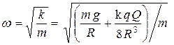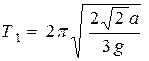 К такому же выводу мы придём, рассматривая изменения энергии маятника в задаче. Ясно, что кинетическая энергия поступательного движения маятника не убывает за счёт увеличения энергия вращения воды, что происходит в случае её замерзания, а как и в случае математического маятника возрастает только за счёт убыли потенциальной гравитационной энергии при его движении вниз. Следовательно, по формуле Гюйгенса период малых колебаний равен: