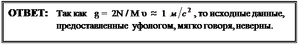 Задача № 55 (5 баллов ) Решение: (РОФ, 2007) Двигатели НЛО совершают работу над газом, увеличивая его кинетическую энергию. Считая, что в расчёте на единицу времени из двигателей выбрасывается масса газа, равная µ и все частицы газа имеют одинаковые скорости υ, мощность двигателей «тарелки» в момент её зависания равна: Учитывая, что сила тяги двигателей (реактивная сила) равна F = - µ υ, и условие зависания «объекта» (считая, как обычно, лабораторную систему отсчёта инерциальной) имеет вид M g + F = 0, получим: N = M g υ /2 (2). Отсюда определим ускорение свободного падения: g = 2N / M υ. (3).
