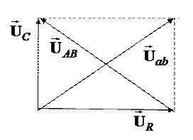 Построим векторную диаграмму напряжений для цепи. Вектор напряжения между точками а и b равен сумме векторов напряжения на конденсаторе и резисторе , т.е. изображается диагональю прямоугольника, построенного на векторах и .