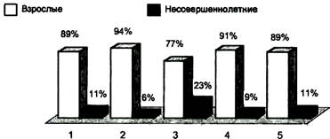 В 1998 г. в нашей стране зарегистрировано 189 293 преступления, совершенных с участием несовершеннолетних, что на 3, 6% больше, чем в 1997 г. В структуре раскрытых преступлений они составляли 11, 1%. В 1999 г. число зарегистрированных преступлений, совершенных при соучастии несовершеннолетних, возросло на 10% и составило 208 313. В том же году зарегистрировано 135 394 преступления, совершенных несовершеннолетними без соучастия со взрослыми. На рис. 3 приводится соотношение преступности взрослых и несовершеннолетних.* * Криминогенная ситуация в России на рубеже XXI века. М., Юриспруденция. 2000. С. 10.