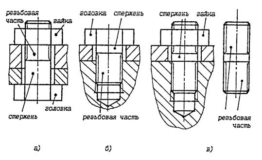 К резьбовым элементам крепежа относятся болты, винты, шпильки, гайки и резьбовые вставки (рис. 3.4). Болтовые соединения (рис. 3.4) используются для соединения деталей относительно небольшой толщины при наличии места для гайки и головки Если данные условия не выполняются, но в одной из деталей можно высверлить резьбовые отверстия, используют винтовые соединения (рис. 3.4). В случае необходимости частой сборки-разборки подобного вида соединений, вызывающей изнашивание резьбовых отверстий в детали, вместо винтовых применяют шпилечные соединения (рис. 3.4) или в резьбовые отверстия вкручивают резьбовые вставки, которые представляют собой втулки из износостойких материалов с наружной и внутренней резьбой. Шпилечные соединения или резьбовые вставки используют, когда материал детали с резьбовым отверстием не обладает высокой твердостью (легкие сплавы, пластмассы).