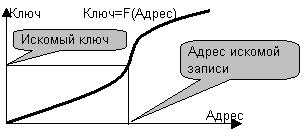 - включение: дана пара ключ - данные. Требуется включить запись в таблицу так, что впоследствии ее можно было найти по ключу. - поиск. Дан ключ, требуется найти запись. - модификация: дан ключ, и новые значения изменяемых полей. Требуется найти запись и изменить данные. - удаление. Дан ключ, требуется найти и удалить запись. Как видно, во всех случаях, прежде чем выполнить операцию, требуется сначала найти запись. Это относится и к операции включения, так как для того, чтобы добавить запись в таблицу, требуется найти место вставки. Следует различать удачный и неудачный поиск (поиск того, чего в таблице нет), а также поиск единственной записи (по первичному ключу) и поиск многих записей, удовлетворяющих критерию поиска. Эффективность этих операций, как правило, различается. Мы будем рассматривать четыре основных способа организации таблиц: - последовательные - сортированные - древовидные - рассеянные (они же рандомизированные или hash – таблицы) Новые записи помещаются в конец таблицы в порядке поступления. Поиск осуществляется перебором записей. Пусть таблица содержит N записей. Для успешного поиска единственной записи требуется просмотреть в среднем N/2 записей; в случае неудачного поиска придется просмотреть всю таблицу, то есть N записей. Поиск по вторичному ключу требует просмотра N записей. В любом случае время поиска пропорционально размеру таблицы. Для того, чтобы физически удалить запись из таблицы, требуется выполнить сдвиг на одну позицию вверх всех нижележащих записей, что требует значительного времени. Как правило, так не поступают. Вместо этого запись помечают как удаленную в специально отводимом для этого байте. Операция упаковки, то есть физического удаления помеченных на удаление записей производится изредка. Такова, например, дисциплина работы со старейшим форматом файлов баз данных – dbf – форматом. Удаленные записи можно "сшить" в стек свободного пространства и использовать для вставки новых записей. Последовательные таблицы есть смысл использовать, когда таблица мала или скорость поиска несущественна. Контрольные вопросы 1) Напишите функцию, выполняющую физическое удаление записей из последовательной таблицы, помеченных символом ‘*’ в 1-м байте. 2) Напишите функцию поиска записи по фамилии в телефонном справочнике, который хранится как последовательная таблица в бинарном файле. 3) Напишите функцию, помещающую новую запись в первую удалённую позицию последовательной таблицы, или в конец таблицы, если удалённые позиции отсутствуют. В обсуждаемых ниже алгоритмах для упрощения предполагается, что ключи – это целые числа, что никак не сказывается на сути дела. Примеры алгоритмов, свободных от каких – либо допущений будут приведены позже. Отметим, что для любого метода организации таблицы решение задачи поиска может быть сформулировано как решение уравнения Ключ=F(Адрес) относительно адреса при заданном ключе. Бинарный поиск в сортированной таблице – это разновидность метода деления интервала пополам для решения уравнения f(x)=0. Действительно, если ключи интерпретировать как числа, то в сортированной таблице они следуют в неубывающем порядке, например, как это изображено на рис. 31.