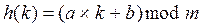 Анализ трудоемкости операций над рассеянной таблицей Рассеянные таблицы (Hash) Таблицы с прямым доступом Пусть в таблице из m записей все записи имеют разные значения ключа k1, k2, …,km и таблица отображается в вектор a1, a2, ..an, где n³m. Если определена функция f(k) такая, что для любого значения ki (i=1…m) 1 £ f(ki) £ n, причем f(ki) ¹ f(kj) при i ¹ j, то табличная запись с ключом k взаимно однозначно отображается в элемент af(k). Функцию f(k) называют функцией расстановки. Доступ к записи по ключу k производится непосредственно путем вычисления f(k). Таблица, для которой существует и известна функция расстановки, называют таблицей с прямым доступом. Подбор функции расстановки, обеспечивающей взаимно однозначное преобразование ключа записи в адрес хранения, на практике можно решить только для постоянных таблиц с заранее известным набором значений ключа. Таблицы с прямым доступом имеют очень ограниченное применение в первую очередь из-за ограничения f(ki)¹f(kj) при i ¹ j, то есть требования взаимной однозначности преобразования ключа в адрес. Можно получить более гибкий метод, если отказаться от этого ограничения. Тогда сделается возможной ситуация f(ki)=f(kj) при i¹j, то есть более чем одна запись претендует на один и тот же адрес хранения. В этом случае ключи называют синонимами, а событие – коллизией. Чтобы таких ситуаций было меньше, функцию расстановки подбирают из соображений случайного и возможно более равномерного распределения ключей по памяти, отведенной для таблицы. Таблицы, построенные по такому принципу, называют рассеянными, рандомизированными или хешированными (hash) таблицами. Метод вычисления адреса называют хешированием. Английский глагол to hash означает нарезать, искрошить, сделать месиво. Функцию расстановки h(k) называют хеш-функцией и стремятся сделать такой, чтобы она равномерно рассеивала ключи по памяти. Будем считать, что хеш-функция имеет не более m различных значений 0£h(k)<m. Хорошая хеш-функция должна удовлетворять двум требованиям: ее вычисление должно быть достаточно быстрым, а число коллизий минимальным. Как правило, хеш-функции используют ту же идею, что и линейные конгруэнтные генераторы псевдослучайных чисел, а именно: