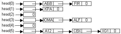 где a и b – тщательно подобранные константы, m – число позиций в таблице. Возможное переполнение при выполнении операций умножения и сложения игнорируется. Для разрешения коллизий существует два метода: метод цепочек переполнения и метод открытой адресации. В методе цепочек переполнения поддерживается m линейных списков (можно деревьев) – по одному на каждый возможный хеш-адрес. После хеширования алгоритм получает адрес головы списка и производит в нем поиск простым перебором, если требуется поиск, или вставляет новую запись вслед за головой, если требуется вставка. Если имеется n ключей и m списков, то средняя длина списка m/n. На рис. 53 изображен массив списков для метода Рис.53 Метод цепочек переполнения