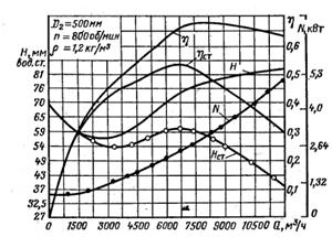Характеристиками вентиляторов называют графики зависимостей напоров, мощности на валу и КПД от объёмной подачи. Характеристики получаются непосредственным испытанием вентиляторов при постоянной частоте вращения и строятся для воздуха при При расчёте характеристик, построенных для нормальных условий и