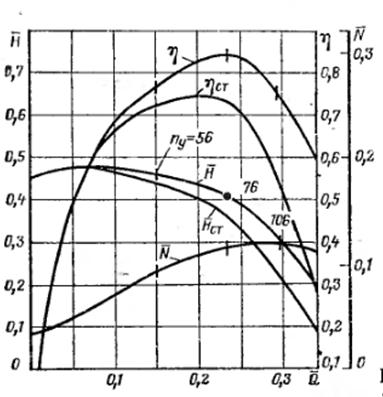 В вентиляторостроении широко применяются безразмерные характеристики, общие для целой серии геометрически подобных машин. На рис.3.6 показана безразмерная характеристика вентиляторов Ц4 – 76, построенная по результатам испытаний модели с