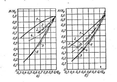 Рисунок 3.8 Изменение потребляемой мощности при различных способах регулирования: а – вентилятор ЦН – 53 с лопастями, отогнутыми назад; б – вентилятор ЦВ – 55 с лопастями, отогнутыми вперёд; 1 – дроссель; 2 – упрощённый направляющий аппарат; 3 – упрощённый осевой направляющий аппарат; 4 – осевой направляющий аппарат; 5 – гидромуфта; 6 – реостат в цепи ротора электродвигателя