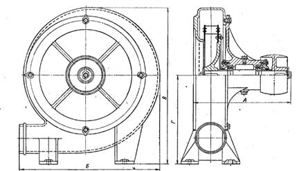Типичным вентилятором высокого давления малой подачи является вентилятор В. Н. Косточкина, широко распространённый в промышленности (Рис.3.17). Особенностями этого вентилятора являются: колесо малой ширины, развитое в радиальном направлении, узкий спиральный корпус, отлитый из чугуна, расположение колеса на консоли вала, высокая частота вращения (до 3600 об/мин для вентилятора с