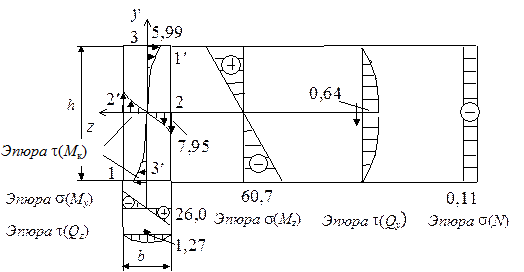 · Точка 3 по середине короткой стороны прямоугольника тоже находится в "балочном" напряженном состоянии. В ней действуют нормальные и касательные напряжения: