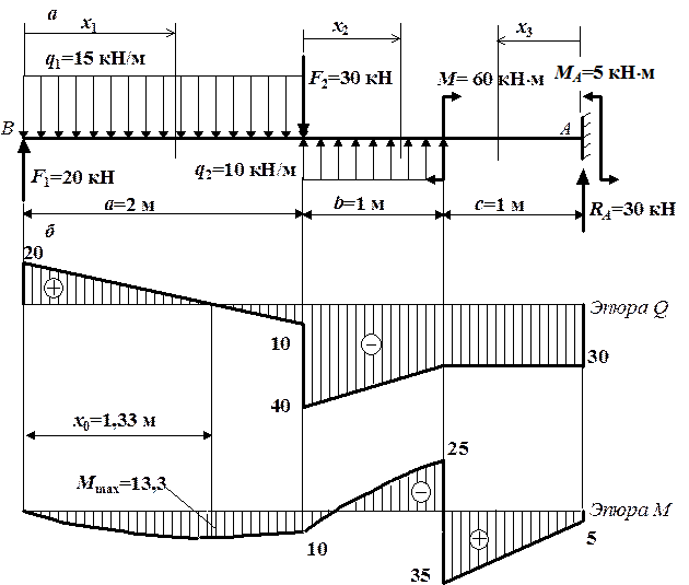 По результатам вычислений в таблице строим эпюры Q и М на каждом участке (см. рис. 4.6, б). Не забываем после построения эпюр проанализировать результаты по тем правилам проверки правильности построения эпюр, которые перечислены ранее.
