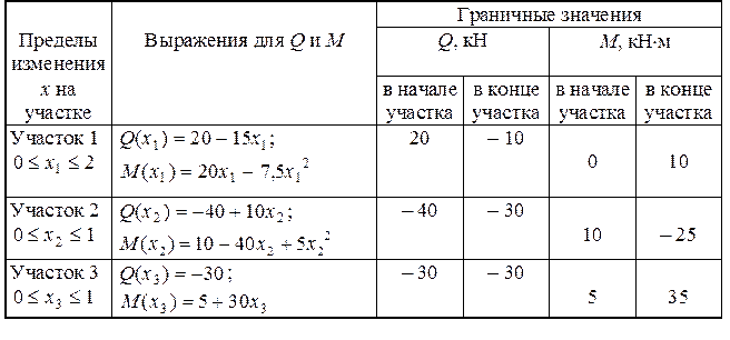 Из этих выражений следует, что поперечная сила на третьем участке – постоянная величина, а изгибающий момент меняется по линейному закону и на границах участка имеет следующие значения: в начале участка ( в конце участка ( Запишем результаты определения внутренних усилий в таблицу, сосчитав численные значения Q и М на границах участков (табл. 1). Таблица 1