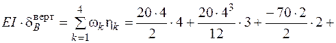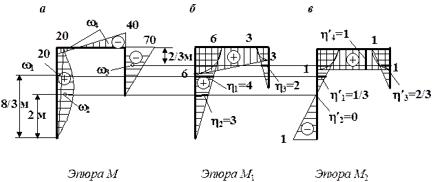 В соответствии с правилом знаков метода Максвелла – Мора положительный знак вертикального перемещения говорит о том, что точка В перемещается по направлению обобщенной силы, то есть вверх. Сечение А поворачивается по часовой стрелке (в сторону, противоположную направлению единичной пары сил, так как знак угла поворота отрицательный). Вариант 2. Интегрирование формулы Максвелла – Мора с помощью правила Верещагина