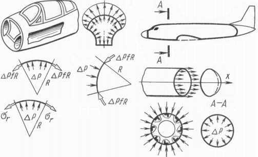 В гермокабинах при полете на больших высотах поддерживается избыточное давление до 40 - 60 КПа. Наиболее рациональной формой гермоотсека, обеспечивающей его минимальную массу, является сфера или немного уступающая ей по выгодности - цилиндр со сферическими днищами. Шпангоут в стыке цилиндра со сферическим сегментом за счет перелома обшивки испытывает достаточно большие сжимающие нагрузки и должен быть усилен. Обшивка в таких отсеках при нагружении избыточным давлением полностью избавлена от изгибных деформаций и работает только на растяжение.