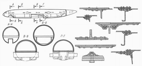 На показанных сечениях фюзеляжа жирными линиями обозначены границы герметизации, которые определяют места расположения плоских герметичных панелей. С помощью специальных гермоузлов обеспечивается уплотнение выводов проводки управления, трубопроводов, электрожгутов и т.п. Особое внимание уделяется герметизации фонарей, люков, дверей, окон, что обеспечивается специальными уплотнительными устройствами в виде резиновых лент, жгутов, прокладок, надувных трубок.