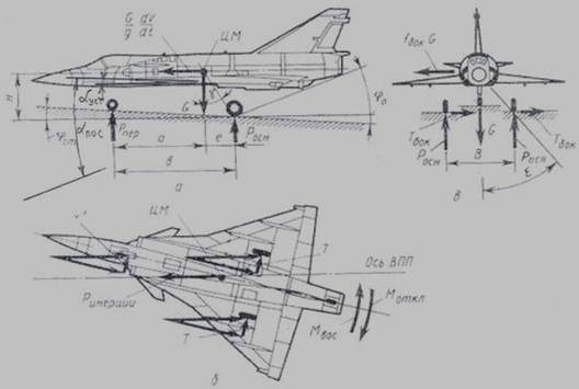 Различают два типа велосипедного шасси: 1) шасси с углом выноса задней опоры g = (25 - 30)о и e/b = 0,1 - 0,15. Параметры такого шасси, кроме колеи, выбираются аналогично параметрам трехопорного шасси с носовой опорой. Взлет и посадка такого самолета ничем не отличаются от аналогичных режимов самолета с рассмотренной выше схемой шасси.