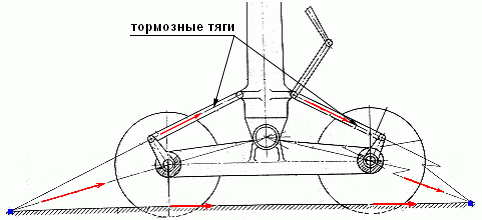 Это приводит к неравномерному износу колес и снижает эффективность торможения на пробеге. Чтобы исключить влияние тормозных моментов на перераспределение нагрузки между осями колес эти моменты обычно не передаются на раму тележки. В этом случае корпус тормоза устанавливается на оси подвижно (или ось вместе с корпусом тормоза шарнирно закрепляются в раме) и удерживается от вращения при торможении специальной тягой, закрепленной на стойке (штоке амортизатора) выше или ниже шарнира подвески тележки. Расположение такой тормозной тяги должно подчиняться простому правилу - ось тяги должна быть направлена в точку пересечения линии, проходящей через ось шарнира тележки и ось колеса, с линией земли при обжатых пневматиках колес. Если шарнир тележки и оси колес расположены на одной горизонтали, то тормозная тяга располагается горизонтально.