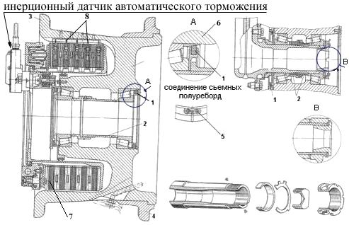 Корпус колеса (6) изготавливается литьем из алюминиевого или титанового сплава. В последнее время появились колеса с корпусами из двух штампованных половин, соединяемых болтами. В ступицу корпуса с двух сторон запрессовываются радиально-упорные подшипники. Подшипники защищаются от грязи специальным уплотнением 1. Между подшипниками вставляется регулируемая распорная втулка 2, тарируемая на определенную затяжку подшипников. Пневматики монтируются на корпус и фиксируются на нем двумя ребордами 3 и 4, одна из которых (4) - съемная, состоит из двух половин, которые соединяются специальными замками 5. Внутри корпуса колеса устанавливаются тормоза (7). В зависимости от типа тормоза к внутренней поверхности корпуса крепятся стальные оребренные тормозные рубашки или устанавливаются шлицы (8) для тормозных дисков