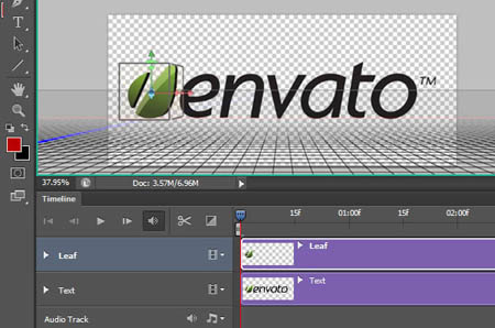 Наша мета полягає в тому, щоб 3D об'єкт лист постійно обертався навколо своєї осі, але показував весь час тільки свою передню частину. Щоб зробити це, потрібно спочатку дублювати шар Leaf в палітрі шарів. Звернете увагу, що копія шаруючи з листом відразу ж з'явиться і в шкалі часу.