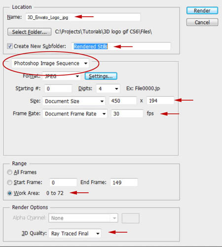 Варіант 2 – вимагає рендеринга нашої сцени. Це настійно рекомендується для поліпшення якості кінцевого продукту. Йдемо в меню Файл – Експортувати – Проглянути відео (File > Export > Render Video) і внесіть зміни, як показано на скриншоте. Переконаєтеся, що у вас встановлений параметр Послідовність зображень Photoshop (Photoshop Image Sequence) для виходу і Остаточне трасування променів (Ray Traced Final). Цей метод зробить нашу сцену у вигляді окремих кадрів.