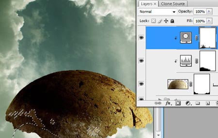 Створіть новий порожній шар, включите йому обтравочную маску, як це робили з попередніми шарами, що коректували. Намалюйте рваний контур в нижній частині грунту пензликом "Texture 3" із стандартного набору Різні кисті (Assorted Brushes).
