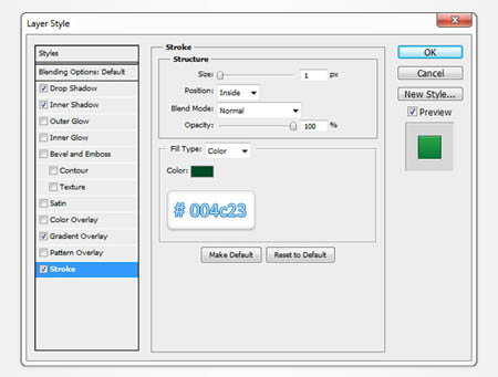 Виділите всі векторні фігури, створені до цих пір, і згрупуйте їх Ctrl + G. Двічі клацніть по групі і зміните її назву на Grey Slider. Клацніть правою кнопкою миші по цій групі і виберіть пункт Дублікат групи(Duplicate Group). Очевидно, що ця команда створить копію групи. Виділите копію, зміните назву на Green Slider і перетягнете дублікат на декілька пікселів вниз, як показано на скриншоте. Тепер вам потрібно буде відредагувати декілька фігур усередині цієї групи. Почнемо з довгого прямокутника з круглими кутами. Відкрийте вікно налаштувань стилів шаруючи і відредагуйте Накладення градієнта (Gradient Overlay) і Обведення (Stroke). Налаштування дивитеся нижче на скриншотах.