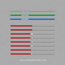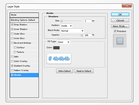 Зробіть копію групи, створеної в кроці № 23, перемістите на декілька пікселів вниз і відкрийте її. Виділите шар з фигурой- кнопкою і видалите його. Виберіть інструмент Прямокутник з кутами (Rounded Rectangle Tool), що округляють, встановите радіус на 3 пікселі і створіть фігуру розміром 16 на 16 пікселів. Розташуєте цей квадрат, як показано на скриншоте. Перетягнете цей шар всередину створеної групи нижче за два тонкі прямокутники. Застосуємо стилі шаруючи для квадратної фігури. Це будуть ті ж стилі, що для фігури в кроці 25.