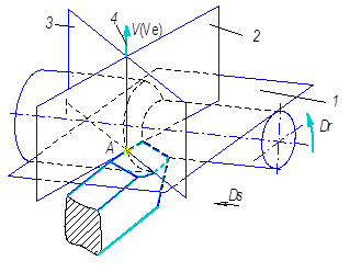 1) основная плоскость - Pv; 2) плоскость резания - Pn; 3) главная секущая плоскость - Pt; 4) V (Ve) – вектор скорости главного движения Dr (или скорости результирующего движения – De). Рисунок 1.4 – Расположение координатных плоскостей относительно кинематических элементов процесса резания: