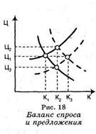 для получения товара. С чисто экономической точки зрения цена представляет собой баланс спроса и предложения, который может иллюстрировать график кривых спроса и предложения. Их пересечение (точка равновесия) и демонстрирует этот баланс (рис. 18). Представленные штриховыми линиями сдвиги кривых спроса (например, за счет роста платежеспособного потребителя) и предложения (например, за счет роста производительности труда, снижения издержек, технологического прогресса) приводят к соответствующим сдвигам точки равновесия, а значит — к соответствующей динамике цен. В приведенном примере рост платежеспособности ведет к росту цены (Ц2) и объема продаж (К2). Рост предложения — к снижению цены (ЦЗ) при росте объема продаж (К2). Одновременный рост С и П (в данном примере) ведет к росту продаж (КЗ) при тех же ценах (Ц1). Таким образом, рост Ц ведет к росту П и ограничению С. Снижение Ц — к снижению П и росту С. Рост С ведет к повышению Ц, а его снижение — к снижению Ц. Рост П ведет к снижению Ц, а падение II — к росту Ц. Следует только помнить, что в реальном бизнесе Ц может определяться не только экономическими целями (социальная политика, конкурентная борьба, репутация, государственные ограничения и т. д.). С точки зрения потребителя, чем больше К, тем ниже Ц, а с точки зрения производителя — чем больше К, тем выше Ц. Следовательно, чем богаче потребитель, тем правее и выше точка равновесия. Чем мощнее производитель — тем правее и ниже точка равновесия. И наоборот — чем беднее потребитель, тем левее и ниже, а чем слабее производитель, тем левее и выше точка равновесия. На основе этих зависимостей ожидаемая прибыль может быть выражена формулой: Прб = (Ц - Сбс) х К, где Прб — прибыль, а Сбс,— себестоимость товара при данном объеме продаж К. Поэтому главное в ценовой стратегии при установлении Ц — это баланс С, П и внеэкономических целей. МЕНЕДЖМЕНТ В СФЕРЕ КУЛЬТУРЫ
