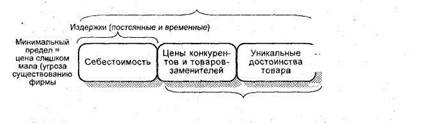 Таким образом, анализ емкости рынка, эластичности спроса дает знание максимально возможной цены товара на данном рынке и ее влияния на динамику спроса. Определение издержек Определение издержек или расчет себестоимости дает представление о минимально допустимой для фирмы цены товара. Цена, меньшая, чем сумма издержек, несет фирме убытки. Издержки складываются из постоянных (накладных расходов, включающих аренду, электричество, тепло, заработную плату и др.) и переменных издержек, зависящих от объема производства (сырье, материалы и т. п.). Определение ценовой ситуации Определение ценовой ситуации включает решение ряда задач. Важно определить доминирующий на рынке тип механизма ценообразования. В случае чистой конкуренции цена есть баланс спроса и предложения: цена выше точки равновесия невозможна, а ниже — убыточна. В случае монопольной конкуренции действенен веер цен по товарам, сегментам рынка и т. д. На олигонолистическом рынке (при небольшом числе продавцов) высок риск завышения или занижения цены. В случае чистой монополии (один продавец) возможны три основных варианта: 1. При государственной монополии цены могут быть ниже себестоимости (например, для социально значимых товаров и услуг), могут ограничиваться покрытием издержек (в случае нонпрофита цены равны себестоимости), могут предполагать небольшую прибыль (плановые накопления) и могут быть очень завышены (в целях, 4. МАРКЕТИНГ