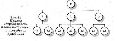 О — новогодний праздник; 1 — привлечение посетителей на праздник; 1.1 — обеспечение рекламы; 1.2— распространение приглашений; 2— привлечение в кружки и коллективы; 2.1 — выставка-продажа изделий; 2.3 — конкурс-викторина; 3 — организация отдыха и развлечений; 3.1 — представление; 3.2 — игры и аттракционы. 5. ТЕХНОЛОГИЯ ПЛАНИРОВАНИЯ