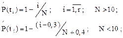 Оценку показателей безотказности можно получить и тогда, когда нам неизвестен вид закона распределения или известно, что распределение относится к классу возрастающей функции интенсивности отказов (ВФИ-распределение). В этом случае оценивание осуществляют на основе непараметрических методов, одним из которых является метод множительной оценки показателей безотказности. Начинают с вычисления функции распределения наработок непосредственно по упорядоченной статистической совокупности, в которой наработки до отказа и до цензурирования выстроены в порядке неубывания. Если значения наработки до цензурирования равны значениям наработки до отказа, то сначала указывается наработка до отказа, затем наработка до цензурирования. Для каждой наработки до отказа ti вычисляют оценки вероятности безотказной работы Вычисления при планах [NUN], [NUT] производят по формулам: