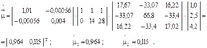 Пример 3.3. Измерения зазора в шарнире универсального шпинделя в начальный момент времени, через 14, 28 сут на трёх комплектах вкладышей дали следующие результаты, мм: [1,1-2,7-4,3]; [1,0-2,5-4,3]; [0,9-2,3-4,0]. Найти значения показателей долговечности комплекта вкладышей Решение. В соответствии с зависимостью (3.10) необходимо найти оценки среднего зазора Принимаем, что изменение зазора в шарнире описывается зависимостью U(t)=U0+I t · t+e(t) или U(t)=U0 ·j1(t)+I t ·j2(t)+e(t), где U0 - начальный зазор; I t - скорость изнашивания; j1(t), j2(t) - базисные функции; e(t) - не зависящий от U0 и I t слабо коррелированный случайный шум, дисперсия которого удовлетворяет условию: D2=D[e(t)]/D(U0)= 0,01. Случайный шум есть результат появления накапливающихся случайных ошибок при измерении величины износа, которые независимы и распределены нормально с нулевым средним значением и дисперсией вида s2 ·D2, где D2 - заданная величина. Полагаем, что U(t), U0, I t – нормально распределённые случайные величины с математическими ожиданиями s2; s12; s22 соответственно. Тогда m=m1 + m2t + e(t). Измерения зазоров в шарнире производятся в регламентированные моменты времени t =0, 14 сут, 28 сут на трёх комплектах вкладышей. Данные об измерении зазора в указанные моменты времени представим в виде трёх векторов