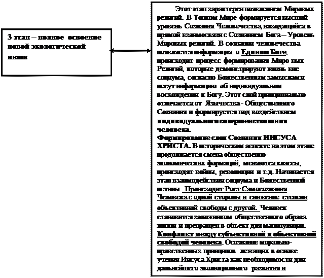 На этом этапе человек представляет собой свободное в энергоинформационном плане существо, но обладает низким самосознанием. Он не знает кто он, откуда пришел, каковы его задачи. Особое взаимодействие 2-х уровней физического вакуума, а точнее прямохождение способствовало возникновению сознания. Эволюционный этап зарождения сознания характерен, по физической морфологии строения человеческого существа, выпрямлением позвоночника человека, уменьшением надбровных дуг и т.д., т.е. тело прочеловека –гоминид подготавливается к особому взаимодействию составляющих физического вакуума, прямому взаимодействию, которое проходит по позвоночнику человека. Душа (психика), которая проходит эволюционный путь развития от простейших до высших животных формируется в форме включающей весь мир, т.е. становится отображением 7-го уровня реальности. Открыты две чакры – Муладхара и Сахасрара, через которые осуществляется вход информации и энергии. Взаимодействие 2-х энергий физического вакуума и Души приводят к возникновению Сознания и человек становится существом на Земле, который соединяет небо и землю. Чакра Сахасрара способствует общению с Богом, т.е. через неё поступает Божественная информация, которая в системе с Душой осознаёт мир. Чакра Муладхара способствует принятию энергии, которая в системе с Душой способствует выработке эмоциональных ощущений – чувства красоты, ощущения утонченной гармонии, понимания, нравственные чувства. Возникает произвольное воображение, которое служит, по утверждению И. Канта «пусковой пружиной» подавляющего большинства психических процессов человека, в том числе и мыслительных актов (6, с.333). Произвольное воображение представляет собой реакцию не на внешний стимул, а «реакцию на отсутствие», по определению психиатра П. Жане (6,с.333). Оно способствует образованию системы нравственных ценностей, т.е. человеческое сознание благодаря способности представления в идеальном плане возможных последствий (в том числе и негативных) поступков оценивает свои действия. Идеальные образы (будущие ситуации) формируют систему нравственных запретов – систему табу. Из строения мира, которое предлагает культурно-историческая концепция, вытекает вывод о том, что вся информация истина. Отличие в осознанном принятии информации заключается в наборе смысловых ключей, которыми обладает сознание. На этом эволюционном этапе человек «жил в раю», т.е. получал достоверную информацию о мире на своём уровне развития сознания. Он был свободным целостным существом и представлял собой закрытую от посторонних энергоинформационных влияний систему. Следует особо отметить, что с возникновением сознания возникает религия, т.е. определенное мировоззрение человека, система табу и Вера в бессмертие Души. «Исследования древнекаменного века, словно театр, полны неожиданностей!» - воскликнул однажды известный французский археолог Ж. Лаплан после очередного «сюрприза» в ходе раскопок стойбища первобытных охотников на мамонтов(20,с.5). Археологические открытия приводят к мысли, что современное научное мировоззрение принижает достижения в познании мира, упрощает духовную жизнь и интеллектуальный кругозор людей палеолита (20,с.6). Человек древнекаменного века был творцом, он изучал окружающую действительность – познавал мир- с невероятным 