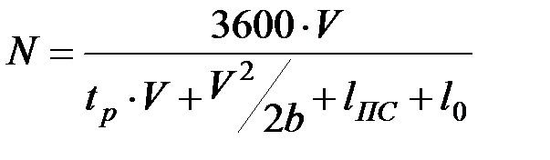 где N – число единиц ПС пропускаемое за час в одном направлении; v – скорость движения на перегоне, м/с; tp – время реакции водителя, с (составляет порядка 0,5-2,0 с); b – замедление при экстренном торможении, м/с2 (составляет порядка 1,0-3,0 м/с2); lПС – длина ПС, м; l0 – дистанция безопасности (промежуток безопасности между следующими друг за другом транспортными единицами, может принято на уровне 5-10м), м. При движении однородных транспортных единиц на многополосной проезжей части пропускная способность каждой из последующих полос уменьшается на 20-40% по сравнению с расчетной пропускной способностью первой полосы. При определении фактической пропускной способности необходимо учитывать ряд факторов, влияющих на пропускную способность транспортной линии: - число остановочных пунктов; - количество пересечений в одном уровне с другими линиями; - тип дорожного покрытия и его состояние; - характер продольного профиля дороги (наличие крутых спусков и подъемов) и т. д. Влияние этих факторов на пропускную способность транспортной линии не всегда поддается точному учету. Поэтому расчеты пропускной способности для реальных условий носят приближенный характер. Большое влияние на пропускную способность линии оказывает время простоя транспортных средств на остановочных пунктах, перекрестках и в узлах пересечений. Для экспрессного безрельсового транспорта, движущегося в общем уличном потоке, пропускная способность между остановочными пунктами всегда значительно ниже, чем теоретическая пропускная способность полосы движения. Это обстоятельство связано с необходимостью выполнять маневры при выходе с остановочных пунктов и входе на них, а также с объездом стоящих вдоль тротуара транспортных средств. Пропускную способность остановочного пункта маршрутного транспорта определяют исходя из продолжительности занятия пункта транспортной единицей: