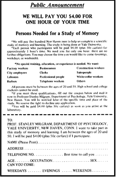 Один из самых неприятных экспериментов в истории провел Стэнли Милграм в начале шестидесятых. Он дал объявление в газете о наборе желающих принять участие в эксперименте за небольшое вознаграждение.