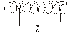 $$$ 588 Бірлік ұзындыққа келетін орам саны n, I тогы бар ұзын соленоид суретте кескінделген. Соленоидтың көлемі магнит өтімділігі m ортамен толтырылған. L тұйық контур бойындағы