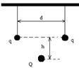 301. Тонкая шелковая нить выдерживает максимальную силу натяжения T = 10 мН. На этой нити подвешен шарик массы m = 0,6 г, имеющий положительный заряд q1= 11 нКл. Снизу в направлении линии подвеса к нему подносят шарик, имеющий отрицательный заряд q2= -13 нКл. При каком расстоянии l между шариками нить разорвется? 302. По кольцу могут свободно перемещаться три положительно заряженных шарика, несущие заряды: q1 на одном шарике и q2 на каждом из двух других. Чему равно отношение зарядов q1 и q2, если при равновесии дуга между зарядами q2 составляет 60о? 303. Отрицательный точечный заряд Q расположен на прямой, соединяющей два одинаковых положительных точечных заряда q. Расстояния между отрицательным зарядом и каждым из положительных относятся между собой, как 1:3. Во сколько раз изменится сила, действующая на отрицательный заряд, если его поменять местами с ближайшим положительным? 304. На двух одинаковых капельках воды находится по одному лишнему электрону, причем сила электрического отталкивания капелек уравновешивает силу их взаимного тяготения. Каковы радиусы капелек? 305. Два отрицательных точечных заряда q1 =-9 нКл и q2= -36 нКл расположены на расстоянии r = 3 м друг от друга. Когда в некоторой точке поместили заряд q0, то все три заряда оказались в равновесии. Найти заряд q0 и расстояние между зарядами q1 и q0.