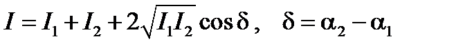 Лекция №17 Волновая оптика. Интерференция света. Когерентность и монохроматичность световых волн. Оптическая длина пути и оптическая разность хода лучей. Способы получения интерференционных картин. Интерференция в тонких пленках. Просветление оптики. Дифракция света и условия ее наблюдения. Принцип Гюйгенса-Френеля. Дифракционная решетка. Дифракция на пространственной решетке. Формула Вульфа-Бреггов Поляризация света. Естественный и поляризованный свет. Поляризация при отражении и преломлении на границе двух диэлектриков. Двойное лучепреломление. Вращение плоскости поляризации. Дисперсия света. Поглощение (абсорбция) света. При наложении световые волн выполняется принцип суперпозиции: результирующий световой вектор является суммой световых векторов отдельных волн. При этом может получиться волна, интенсивность которой не будет равна сумме интенсивностей складывающихся волн. Интерференция свойственна не только световым волнам, являющимися по своей природе электромагнитными волнами, но и волнам любого другого типа. Поскольку волны любого вида удовлетворяют одним и тем же волновым уравнениям, то при описании интерференции любых видов волн применяется один и тот же математический аппарат. Поэтому, сущность интерференции рассмотрим на примере сложения двух одномерных гармонических волн (волн вида