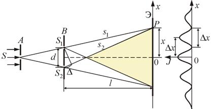 поместим параллельно обеим щелям на одинаковом расстоянии l. Начало отсчета выберем в точке O, относительно которой
