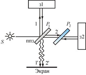 Рис.17.5 В соответствии с последней формулой светлые полосы расположены в местах, для которых Полосы равного наклона можно получить не только в отраженном свете, но и в свете, прошедшем сквозь пластинку. В этом случае один из лучей проходит прямо, а другой – после двух отражений на внутренней стороне пластинки. Однако видимость полос при этом низкая. Для наблюдения полос равного наклона вместо плоскопараллельной пластинки удобно использовать интерферометр Майкельсона (рис.17.6). Рассмотрим схему интерферометра Майкельсона: з1 и з2 – зеркала. Полупрозрачное зеркало