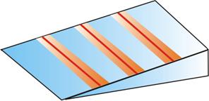 Рис.17.8 Поскольку разность хода лучей, отразившихся от различных участков клина, будет неодинаковой, освещенность экрана будет неравномерной, на экране будут темные и светлые полосы (или цветные при освещении белым светом, как показано на рис.17.8). Каждая из таких полос возникает в результате отражения от участков клина с одинаковой толщиной, поэтому их называют полосами равной толщины. Кольца Ньютона. На рис.17.9 изображена оправа, в которой зажаты две стеклянные пластины. Одна из них слегка выпуклая, так что пластины касаются друг друга в какой-то точке. И в этой точке наблюдается нечто странное: вокруг нее возникают кольца. В центре они почти не окрашены, чуть дальше переливаются всеми цветами радуги, а к краю теряют насыщенность цветов, блекнут и исчезают. Так выглядит эксперимент, в XVII веке положивший начало современной оптике. Ньютон подробно исследовал это явление, обнаружил закономерности в расположении и окраске колец, а также объяснил их на основе корпускулярной теории света. Кольцевые полосы равной толщины, наблюдаемые в воздушном зазоре между соприкасающимися выпуклой сферической поверхностью линзы малой кривизны и плоской поверхностью стекла называют кольцами Ньютона.
