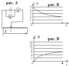 В3. Ученик исследовал зависимость показаний амперметра и вольтметра от длины проволоки x при движении скользящего контакта вправо (рис. А). Зависимости показаний амперметра и вольтметра от длины x показана на рисунках Б и В. Чему равно внутреннее сопротивление r источника?