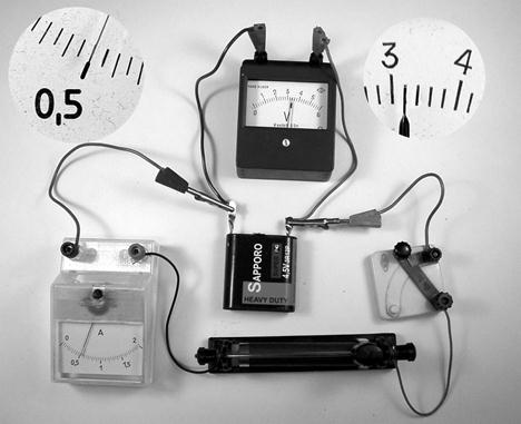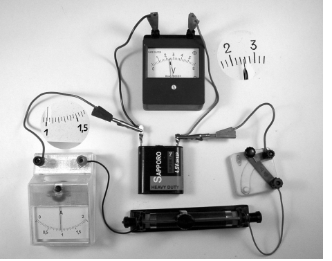 Ученик собрал электрическую цепь, состоящую из батарейки (1), реостата (2), ключа (3), амперметра (4) и вольтметра(5) (см. фотографии: опыт 1, опыт 2). После этого он измерил напряжение на полюсах источника тока и силу тока в цепи при двух положениях ползунка реостата. Определите КПД источника тока в первом опыте.
