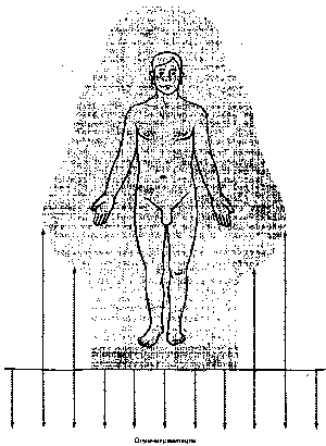 Рис.3. На рисунке представлено применение свойственной телу плазмы для преодоления и нейтрализации гравитации. Испытуемый в биоплазматическом поле парения и передвижения поднимается в воздух.