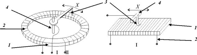 О а ч X ^ C 1 = f 1(X) C2 = f2(X) б Рисунок 7.10—Схемы емкостныхпреобразователей Применяют также дифференциальные преобразователи (рис. 7.10, б), которые позволяют решать некоторые специфические измерительные задачи, например, измерение расхода или скорости газа по перепаду давления, контроль размеров методом сравнения с эталоном и т. д. При воздействии измеряемой величины X одновременно изменяются емкости С 1 и С 2. Такие преобразователи используют для измерения достаточно больших и и угловых перемещений. Преобразователи с использованием зависимости C = f (е) применяют для измерения уровня жидкостей, влажности веществ, толщины изделий из диэлектриков и т. д. Схемы включения емкостных преобразователей, используемые в измерительной технике, очень разнообразны. Наиболее распространенные из них — мостовые, дифференциальные, резонансные и генераторные. Емкостные преобразователи характеризуются рядом положительных качеств: простотой конструкции, малыми геометрическими размерами и массой, незначительным воздействием на измеряемый объект. Кроме того, при рациональном конструировании легко построить преобразователи с различными модифицированными функциями. Однако точность измерений ограничивается рядом погрешностей, к числу которых можно отнести те, что определяются непостоянством температуры и влажности окружающей среды, влиянием паразитных емкостей в преобразователе и схеме его подключения, неточностью изготовления деталей преобразователя. Наиболее существенную погрешность оказывает температура, которая влияет на геометрические размеры деталей преобразователя и на проницаемость среды между обкладками. Резистивные преобразователи по конструкции являются наиболе простыми. Рассмотрим эквивалентную схему резистивного преобразователя для постоянного тока. Сопротивление постоянному току одноэлементного проволочного резистивного преобразователя зависит от его длины l, поперечного сечения S и удельного сопротивления материала/? как R0 = ρ S. Если сечение резистора постоянно по его длине, то R0 = pl/S. Однако, еще необходимо учитывать и сопротивление соединительных проводов и контактов Rк, включенным последовательно с сопротивлением R 0, а также сопротивление изоляции между контактами и сопротивление утечек на корпус или на землю, вместе образующих сопротивление R ут, которое подключено параллельно. При включении резистора в цепь переменного тока необходимо учитывать его индуктивность и емкость. Емкость С может быть образована межвитковыми емкостями и емкостями между резистором и близлежащими элементами. Индуктивность особенно велика у многовитковых проволочных резисторов. Индуктивность L и емкость С являются структурами с распределенными параметрами, однако в большинстве случаев их можно учесть как сосредоточенные элементы L экв и Сэкв. Наличие индуктивности и емкости приводит как к появлению реактивной составляющей сопротивления, так и к некоторому изменению активной составляющей. Эквивалентная схема (рис. 1) может быть представлена в виде последовательного или параллельного включения активного и реактивного сопротивлений, определяемых при малых Lэкв и Сэкв приближенными формулами: X посл = ω(Lэкв - C экв Rˊ 02) = ω∙ Lэкв; X посл = 1/ ω (C экв - L экв/ Rˊ02) = 1/ ω∙C 'экв, где R ˊ0 = (Rˊ 0 + Rˊ к) Rˊ ут/ (Rˊ 0 + Rˊ к + Rˊ ут).