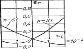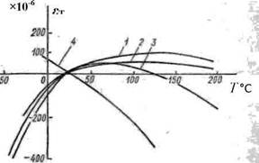 Рисунок 7.14—Зависимости относительного изменения сопротивления от деформации для элементов из кремния Тензорезистивные коэффициенты полупроводниковых тензорезисторов зависят от значений приложенных механических напряжений, что приводит к погрешности линейности зависимости e R от е l. диапазон деформаций должен быть ограничен значениями ±0,1% (рис. 7.14). При изменении температуры изменяется начальное сопротивление тензорезистора и коэффициент тензочувствительности. Таким образом, для тензорезисторов характерна температурная погрешность нуля и температурная погрешность чувствительности. Изменение начального сопротивления наклеенного тензорезистора определяется двумя факторами: изменением удельного сопротивления материала р непосредственно под действием температуры и изменением р под действием дополнительного механического напряжения, появ-ляющегося в тензорезисторе, если коэффициенты линейного расширения детали и тензорезистора не равны. Величина «кажущейся» деформации при воздействии температуры определяется формулой AsT = [ а T /Kтенз (рд- /?тенз)] хГ, (7.22) где ос T - температурный коэффициент сопротивления (ТКС); р Д и fi тенз - коэффициенты линейного расширения (КЛР) материалов детали и тензорезистора. ТКС константана в зависимости от примесей в сплаве может иметь любое значение в пределах ±30 • 10-6 К-1, причем в относительно небольшом интервале температур заданное значение ТКС обеспечивается с погрешностью ±(0,5 + 1)10-6 К -1. Это позволяет для многих материалов объектов измерения (сталь, нержавеющая сталь, сплавы алюминия) изготовлять термокомпенсированные тензорезисторы.