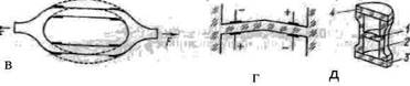 щщл Рисунок 7.29—Структурная схема пьезорезонансного датчика Термочувствительные пьезорезонансные датчики. Конструкция кварцевого термодатчика приведена на рис. 7.29, а. В миниатюрном металлическом герметизированном баллоне (диаметр 6 - 8 мм) размещен линзовый кварцевый резонатор 1, укрепленный, как на растяжках, на токоподводах 2 и 3. Для уменьшения тепловой инерционности баллон заполнен гелием, обладающим хорошей теплопроводностью. Выпускаются также датчики с резонаторами в стеклянных вакуумированных баллонах. Эти датчики имеют большую инерционность, но более высокую временною стабильность и разрешающую способность. На рис. 7.29, б представлена структурная схема датчика, она включает в себя генератор Г 1 с кварцевым термочувствительным резонатором, генератор стабильной частоты Г 2, цепь разности частот РЧ, делитель частоты ДЧ и счетчик Сч с цифровой индикацией. Рабочий температурный диапазон датчиков составляет от - 80 до +250°С и может быть расширен при увеличении погрешности линейности. Рабочие частоты термочувствительных резонаторов лежат в диапазоне 1 - 30 МГц, используются колебания как на основной частоте (1 - 10 МГц), так и на третьей и пятой гармониках (5 - 30 МГц). Тензочувствительные пьезорезонансные датчики. В качестве тензочувствительных резонаторов применяются пьезоэлементы температурнонезависимого АТ-среза, в которых используются колебания сдвига по толщине и колебания изгиба, так как только для этих типов колебаний удается решить проблему развязки между колеблющейся частью резонатора и конструктивными элементами, через которые передается механическая нагрузка. Схематические конструкции и схемы нагружения тензочувствительных пьезорезонаторов показаны на рис. 7.30. В резонаторах (рис. 7.30, а и б) используются колебания сдвига по толщине, поэтому закрепление резонатора и передача усилий могут осуществляться по свободной от колебаний периферии. Резонаторы подобного типа реализуются на диапазон частот 0,3 - 100 МГц, имеют толщину 0,05 - 5 мм при поперечных размерах 3 - 30 мм, относительное изменение частоты при номинальной входной величине Af / f = 0,1 ÷ 1%.