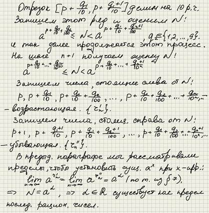 Показательная функция на множестве действительных чисел. Было показано, что функция показательная определена и имеет значения в каждой точке-рациональное число. Необходимо доопределить функцию и найти её значение в каждой токе-иррациональное число.